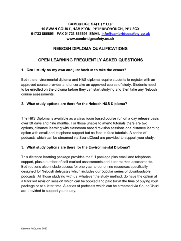 CAMBRIDGE SAFETY LLP 10 SWAN COURT, HAMPTON, PETERBOROUGH, PE7 8GX 01733 865695 FAX 01733 865696 EMAIL info@cambridgesafety.co.uk www.cambridgesafety.co.ukNEBOSH DIPLOMA QUALIFICATIONS OPEN LEARNING