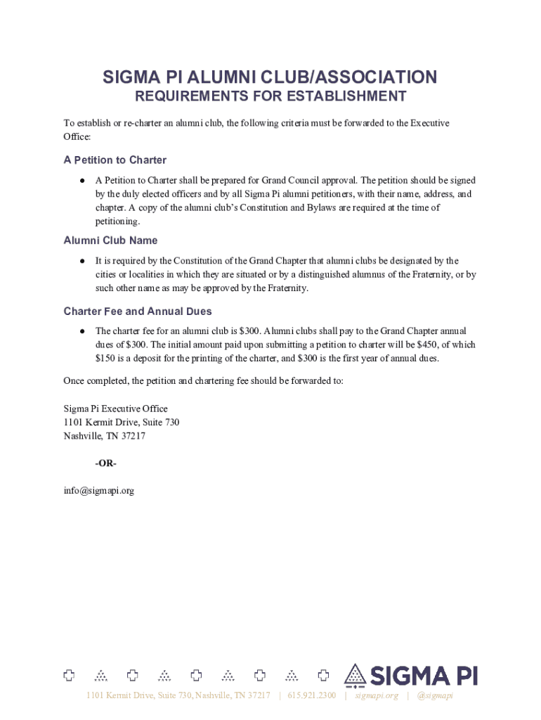 SIGMA PI ALUMNI CLUB/ASSOCIATION REQUIREMENTS FOR ESTABLISHMENT To establish or recharter an alumni club, the following criteria must be forwarded to the Executive Office:A Petition to Charter A Petition