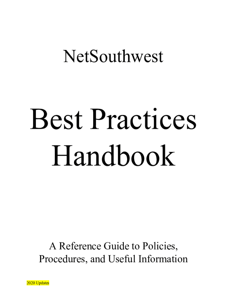 NetSouthwestBest Practices Handbook A Reference Guide to Policies, Procedures, and Useful Information 2020 Updates1Table of Contents System Standards Document page 3I. Cataloging, Acquisitions, and
