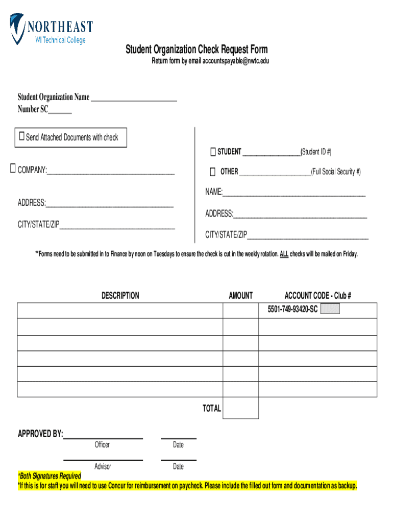 Student Organization Check Request FormReturn form by email accountspayable@nwtc.eduStudent Organization Name ___ Number SC___ Send Attached Documents with check STUDENT ___(Student ID #)COMPANY:___OTHER