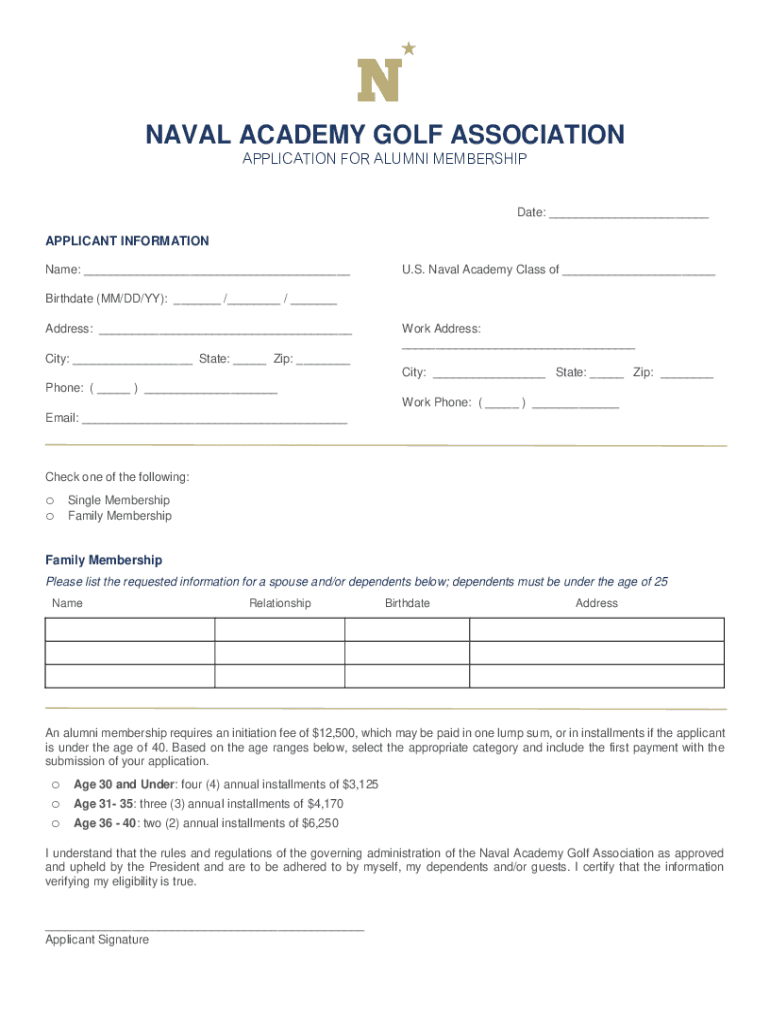 NAVAL ACADEMY GOLF ASSOCIATION APPLICATION FOR ALUMNI MEMBERSHIPDate: ___APPLICANT INFORMATION Name: ___U. S. Naval Academy Class of ___Birthdate (MM/DD/BY): ___ /___ / ___ Address: ___Work Address: