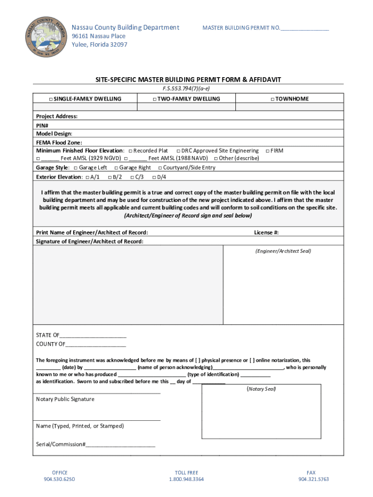 Nassau County Building DepartmentMASTER BUILDING PERMIT NO.___96161 Nassau Place Yule, Florida 32097RESIDENTIAL MASTER FILE INSTRUCTIONS FOR MASTER FILE APPLICATION (Florida Statute 553.794)PART I