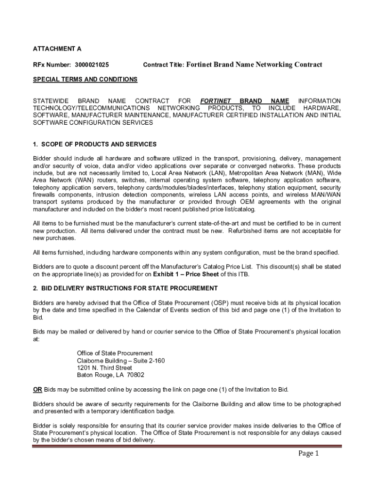 ATTACHMENT A Rex Number: 3000021025Contract Title: Fortinet Brand Name Networking ContractSPECIAL TERMS AND CONDITIONS STATEWIDE BRAND NAME CONTRACT FOR FORTINET BRAND NAME INFORMATION TECHNOLOGY/TELECOMMUNICATIONS