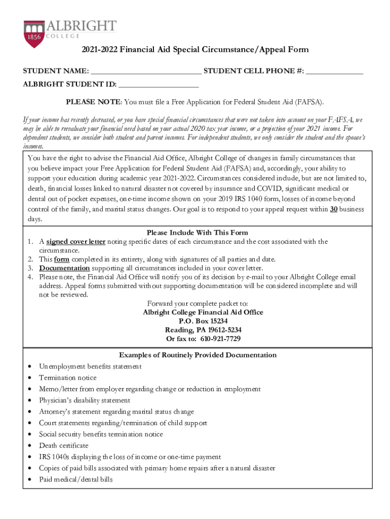 20212022 Financial Aid Special Circumstance/Appeal Form