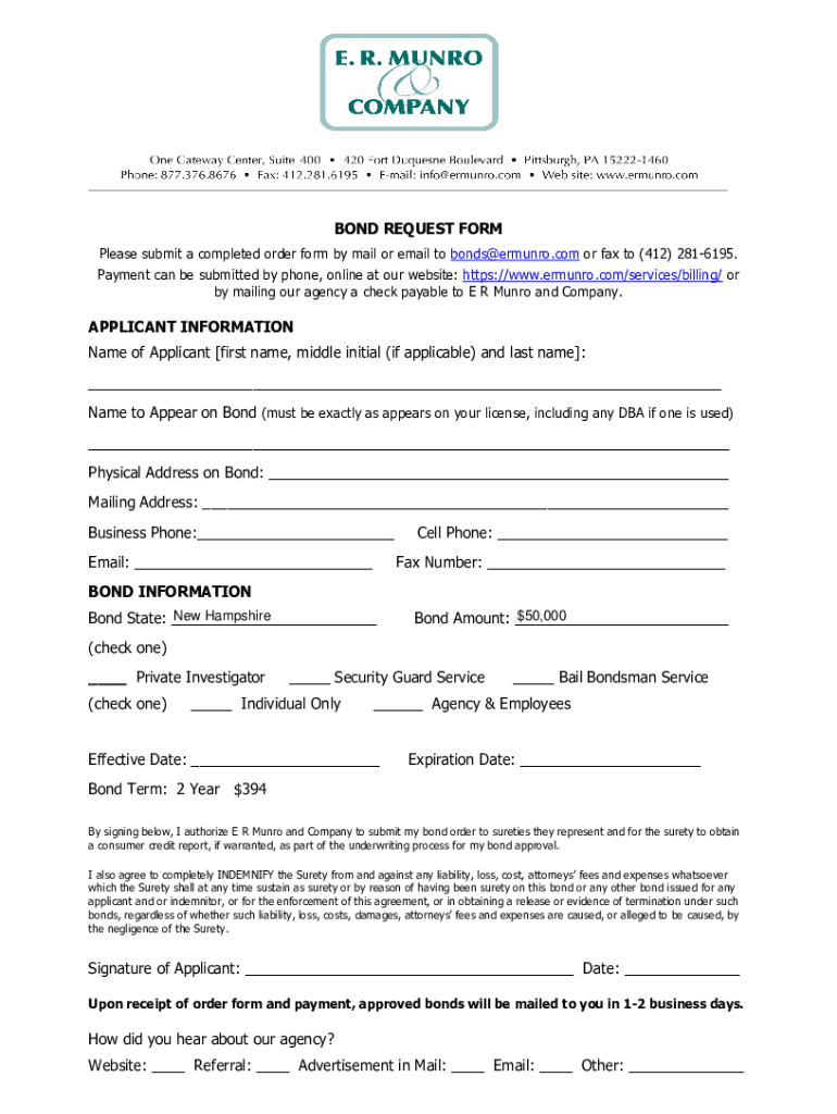 BOND REQUEST FORM Please submit a completed order form by mail or email to bonds@ermunro.com or fax to (412) 2816195. Payment can be submitted by phone, online at our website: https://www.ermunro.com/services/billing/
