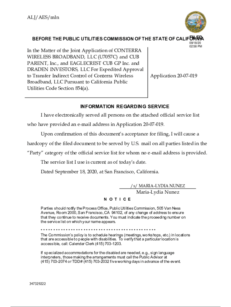 ALJ/AES/misfiled BEFORE THE PUBLIC UTILITIES COMMISSION OF THE STATE OF Californian the Matter of the Joint Application of CANBERRA WIRELESS BROADBAND, LLC (U7057C) and CUB PARENT, Inc., and EAGEREST