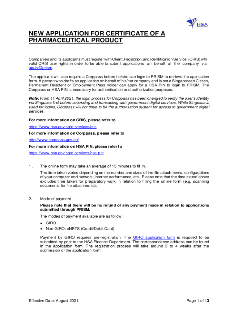 NEW APPLICATION FOR CERTIFICATE OF A PHARMACEUTICAL PRODUCT Companies and its applicants must register with Client, Registration, and Identification Service (CHRIS) with valid CHRIS user rights in
