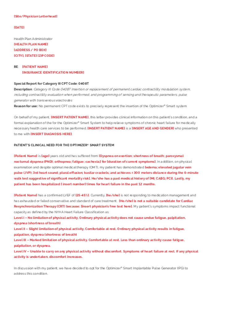 [Site/Physician Letterhead] [DATE] Health Plan Administrator [HEALTH PLAN NAME] [ADDRESS / PO BOX] [CITY], [STATE] [ZIP CODE] RE:[PATIENT NAME] [INSURANCE IDENTIFICATION NUMBER]Special Report for