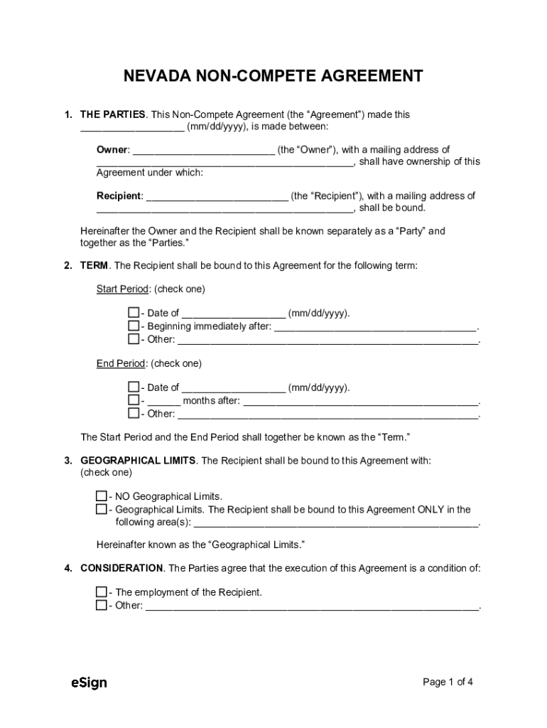 NEVADA COMPETE AGREEMENT 1. THE PARTIES. This Competes Agreement (the Agreement) made this ___ (mm/dd/YYY), is made between: Owner: ___ (the Owner), with a mailing address of ___, shall have ownership