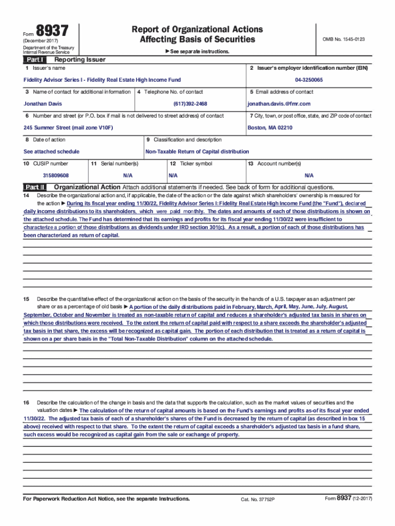 8937Report of Organizational Actions Affecting Basis of SecuritiesFonn (December 2017) Department of the Treasury Internal Revenue Service :r.r See separate instructions. Reporting Issuer1 Issuer\'s