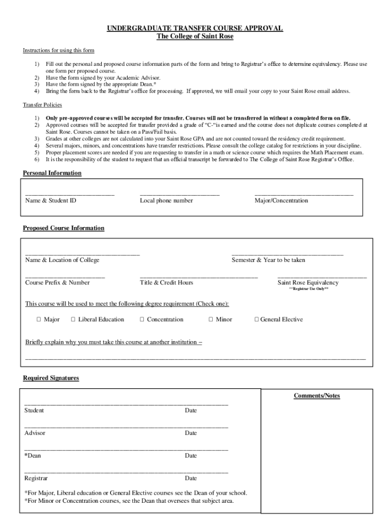 UNDERGRADUATE TRANSFER COURSE APPROVAL The College of Saint Rose Instructions for using this form 1) 2) 3) 4)Fill out the personal and proposed course information parts of the form and bring to Registrars