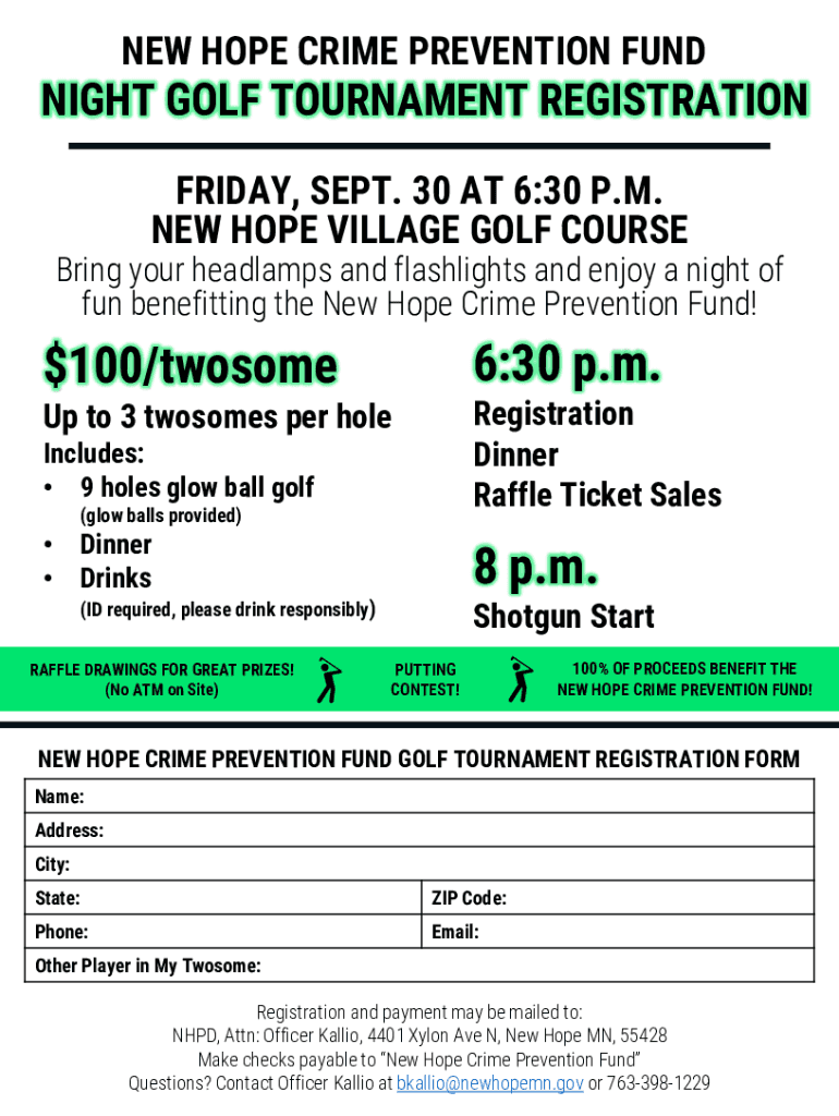 NEW HOPE CRIME PREVENTION MIDNIGHT GOLF TOURNAMENT REGISTRATION FRIDAY, SEPT. 30 AT 6:30 P.M. NEW HOPE VILLAGE GOLF Couriering your headlamps and flashlights and enjoy a night of fun benefitting the