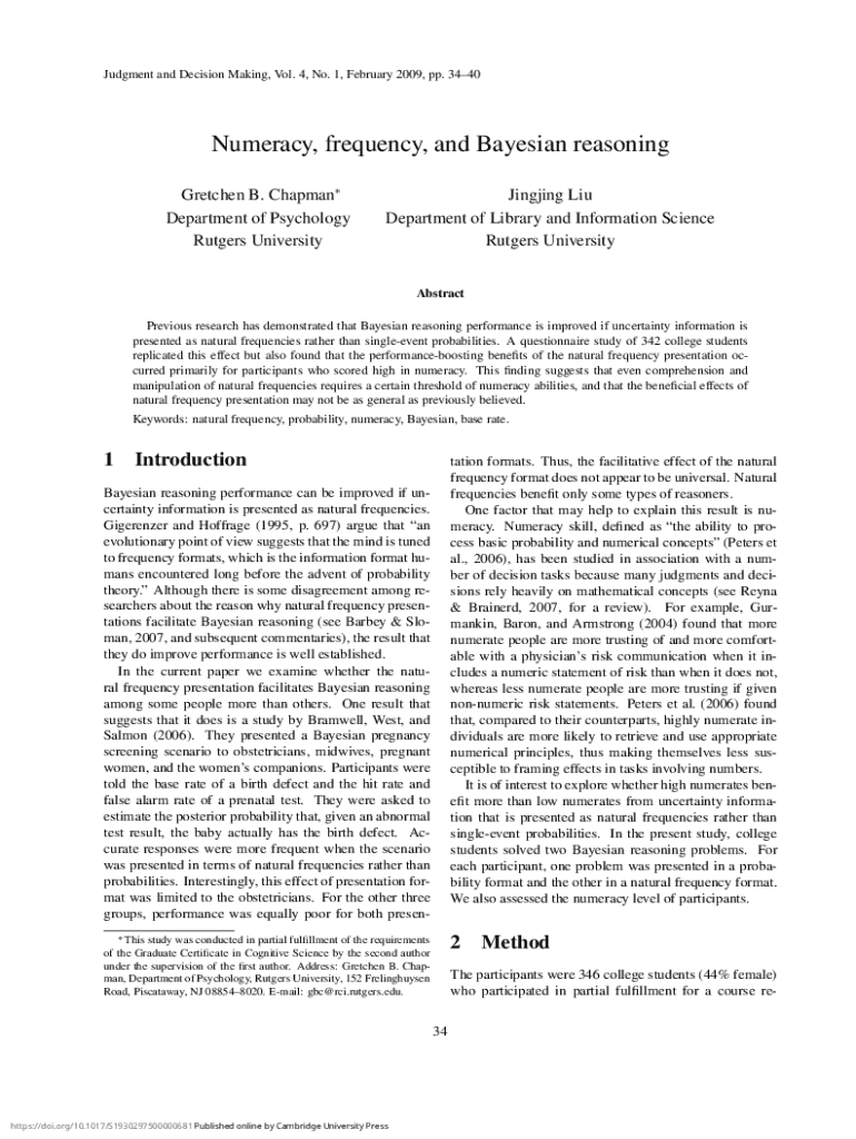 Judgment and Decision Making, Vol. 4, No. 1, February 2009, pp. 3440Numeracy, frequency, and Bayesian reasoning Gretchen B. Chapman Department of Psychology Rutgers UniversityJingjing Liu Department