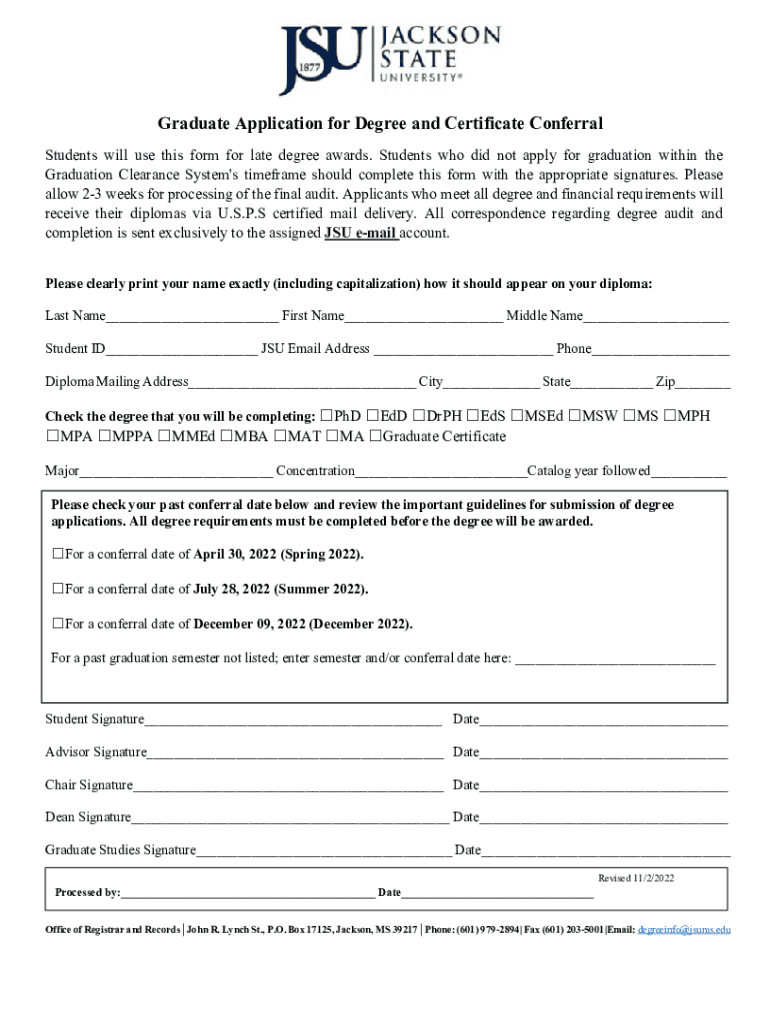 Graduate Application for Degree and Certificate Conferral Students will use this form for late degree awards. Students who did not apply for graduation within the Graduation Clearance System\'s timeframe