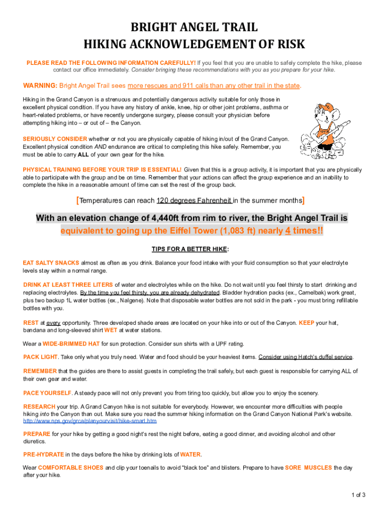 BRIGHT ANGEL TRAIL HIKING ACKNOWLEDGEMENT OF RISK PLEASE READ THE FOLLOWING INFORMATION CAREFULLY! If you feel that you are unable to safely complete the hike, please contact our office immediately.