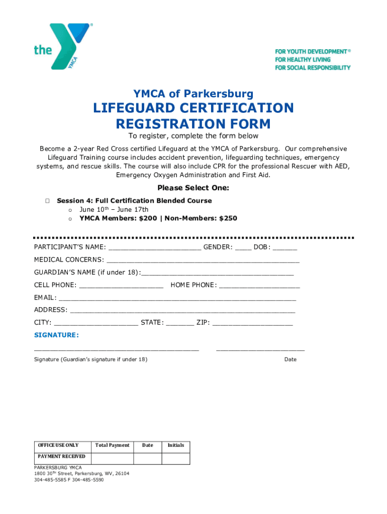 YMCA of ParkersburgLIFEGUARD CERTIFICATION REGISTRATION FORM To register, complete the form belowBecome a 2year Red Cross certified Lifeguard at the YMCA of Parkersburg. Our comprehensive Lifeguard