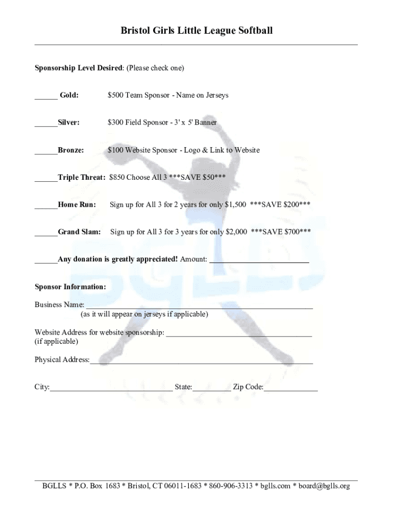Bristol Girls Little League Softball ___ Sponsorship Level Desired: (Please check one) ___ Gold:$500 Team Sponsor Name on Jerseys___Silver:$300 Field Sponsor 3\' x 5\' Banner___Bronze:$100 Website