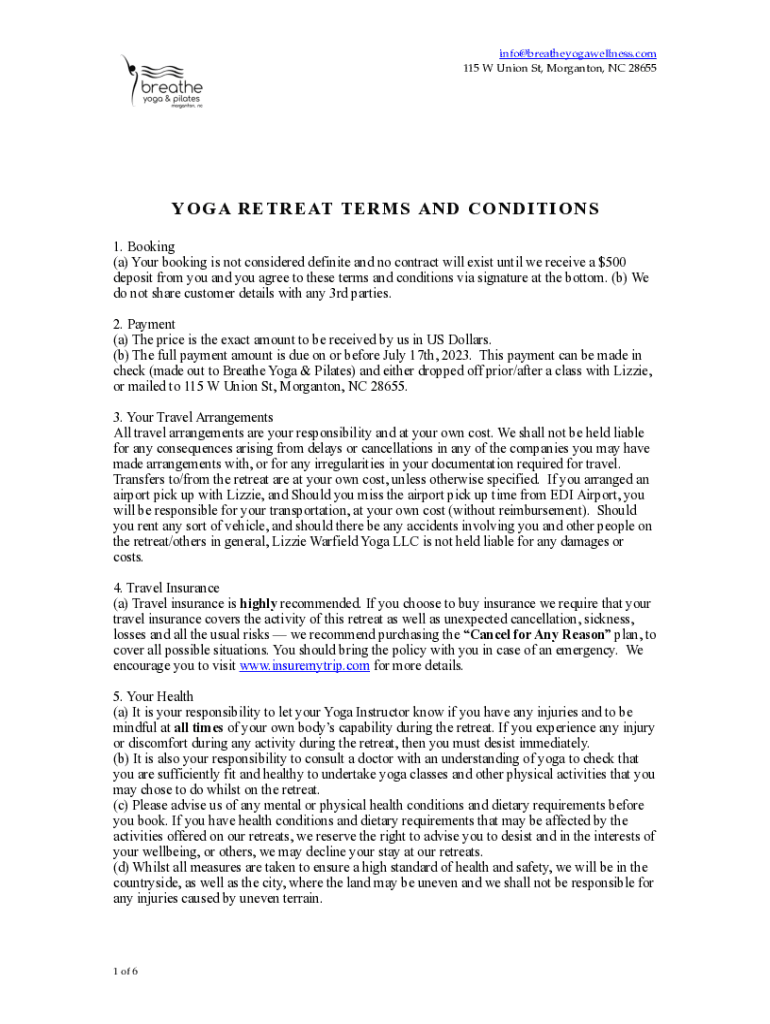 Info@breatheyogawellness.com 115 W Union St, Morgantown, NC 28655Y O G A R E T R E AT T E R M S A N D C O N D I T I O N S 1. Booking (a) Your booking is not considered definite and no contract will