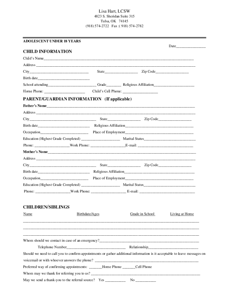 Lisa Hart, LCSW 4823 S. Sheridan Suite 315 Tulsa, OK 74145 (918) 5742722 Fax :(918) 5742782ADOLESCENT UNDER 18 YEARS Date___CHILD INFORMATION Child's Name___ Address ___ City___State___Zip Code___Birth
