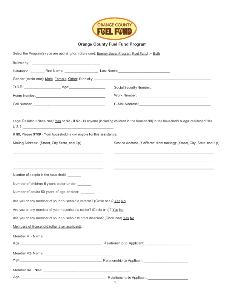 Orange County Fuel Fund Program Select the Program(s) you are applying for: (circle one): Energy Saver Program Fuel Fund or Both Referred by: ___ Salutation: ___ First Name: ___ Last Name:___ Gender
