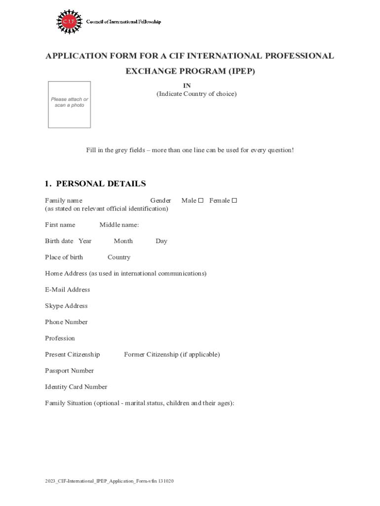 APPLICATION FORM FOR A CIF INTERNATIONAL PROFESSIONAL EXCHANGE PROGRAM (PEP) IN (Indicate Country of choice)Fill in the gray fields more than one line can be used for every question!1. PERSONAL DETAILS