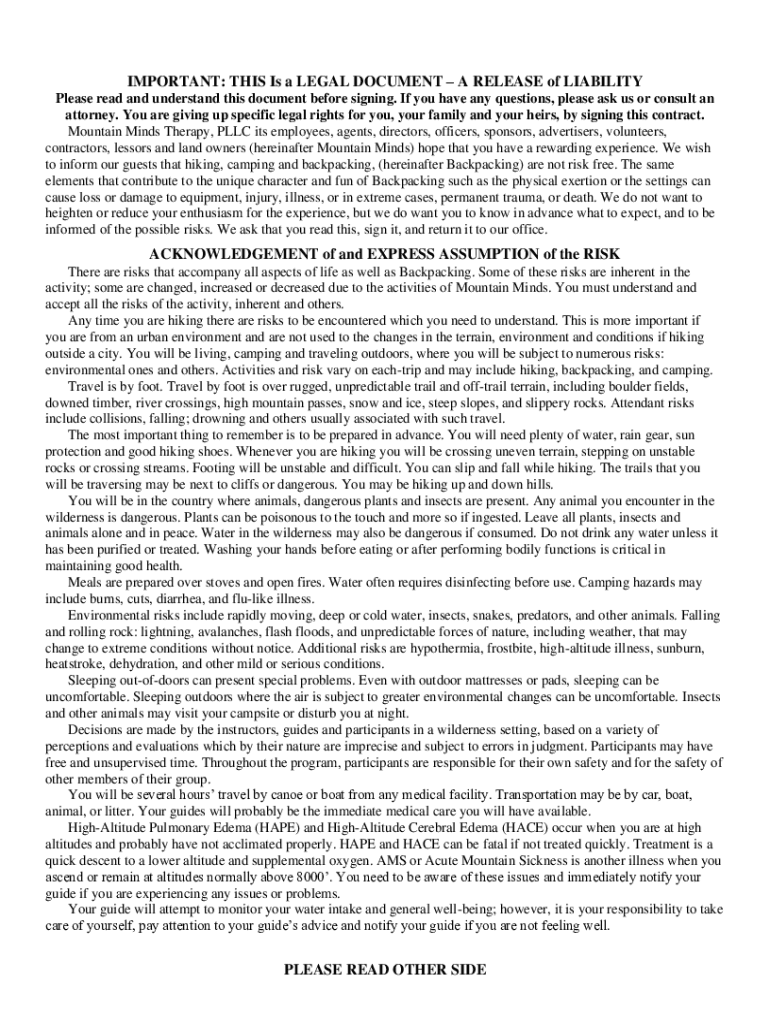 IMPORTANT: THIS Is a LEGAL DOCUMENT A RELEASE of LIABILITY Please read and understand this document before signing. If you have any questions, please ask us or consult an attorney. You are giving