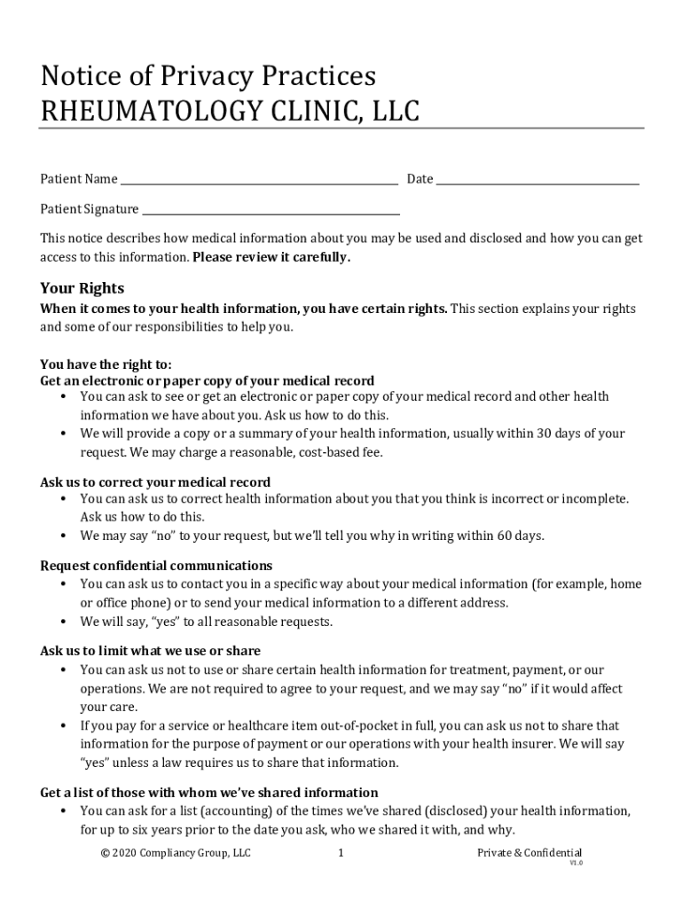 Notice of Privacy Practices RHEUMATOLOGY CLINIC, Patient Name ___ Date ___ Patient Signature ___This notice describes how medical information about you may be used and disclosed and how you can get