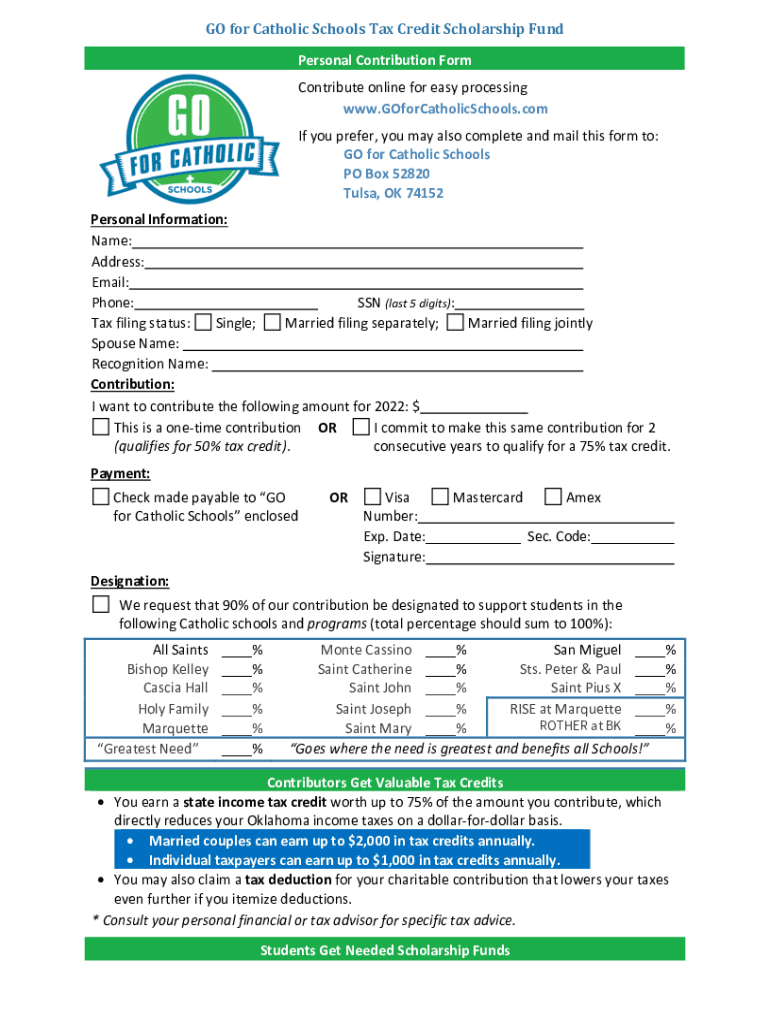 GO for Catholic Schools Tax Credit Scholarship Fund Personal Contribution Form Contribute online for easy processing www.GOforCatholicSchools.com If you prefer, you may also complete and mail this