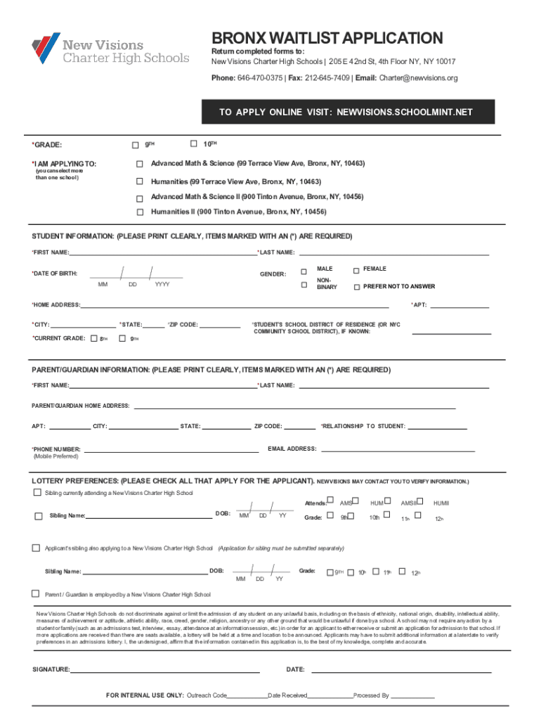 BRONX WAITLIST APPLICATIONReturn completed forms to: New Visions Charter High Schools | 205 E 42nd St, 4th Floor NY, NY 10017 Phone: 6464700375 | Fax: 2126457409 | Email: Charter@newvisions.orgTO