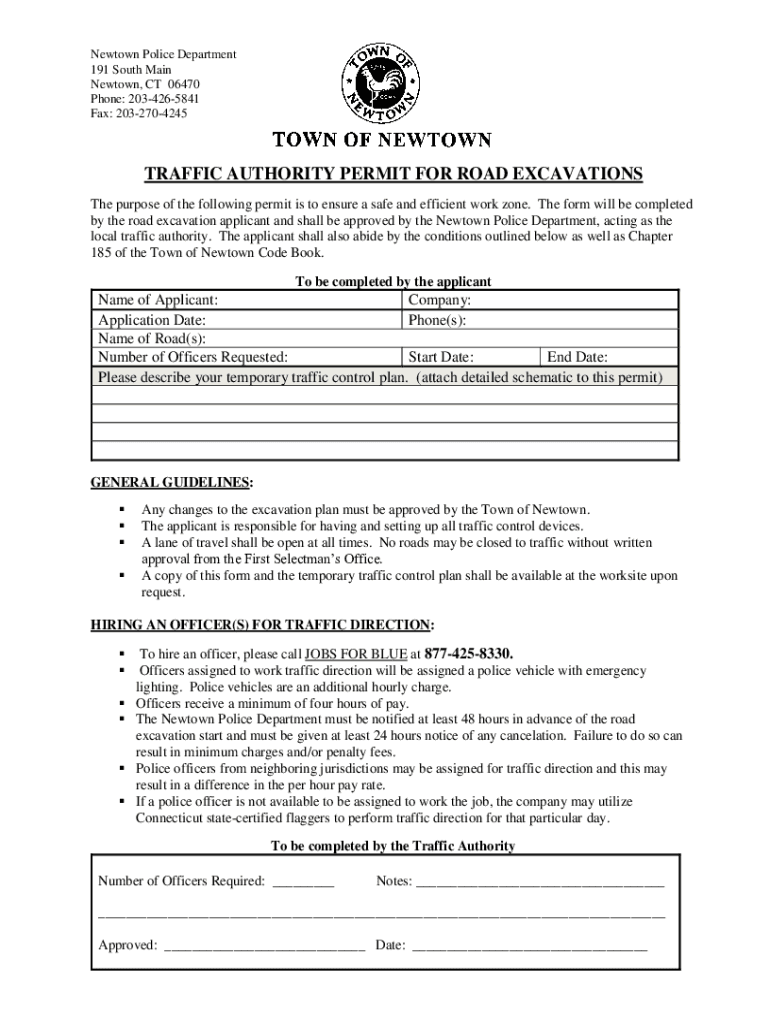 Newton Police Department 191 South Main Newton, CT 06470 Phone: 2034265841 Fax: 2032704245TRAFFIC AUTHORITY PERMIT FOR ROAD EXCAVATIONS The purpose of the following permit is to ensure a safe and