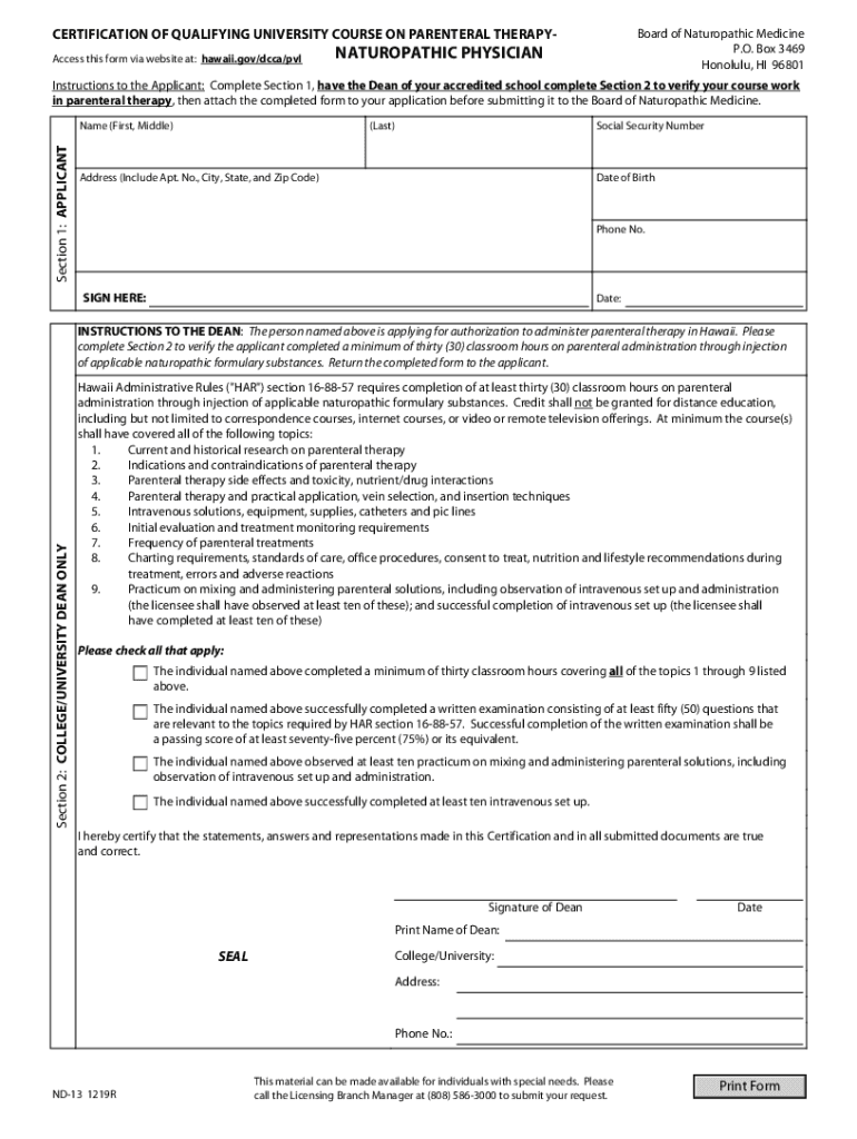 CERTIFICATION OF QUALIFYING UNIVERSITY COURSE ON PARENTERAL THERAPYAccess this form via website at: hawaii.gov/dcca/pvlBoard of Naturopathic Medicine P.O. Box 3469 Honolulu, HI 96801NATUROPATHIC PHYSICIANInstructions