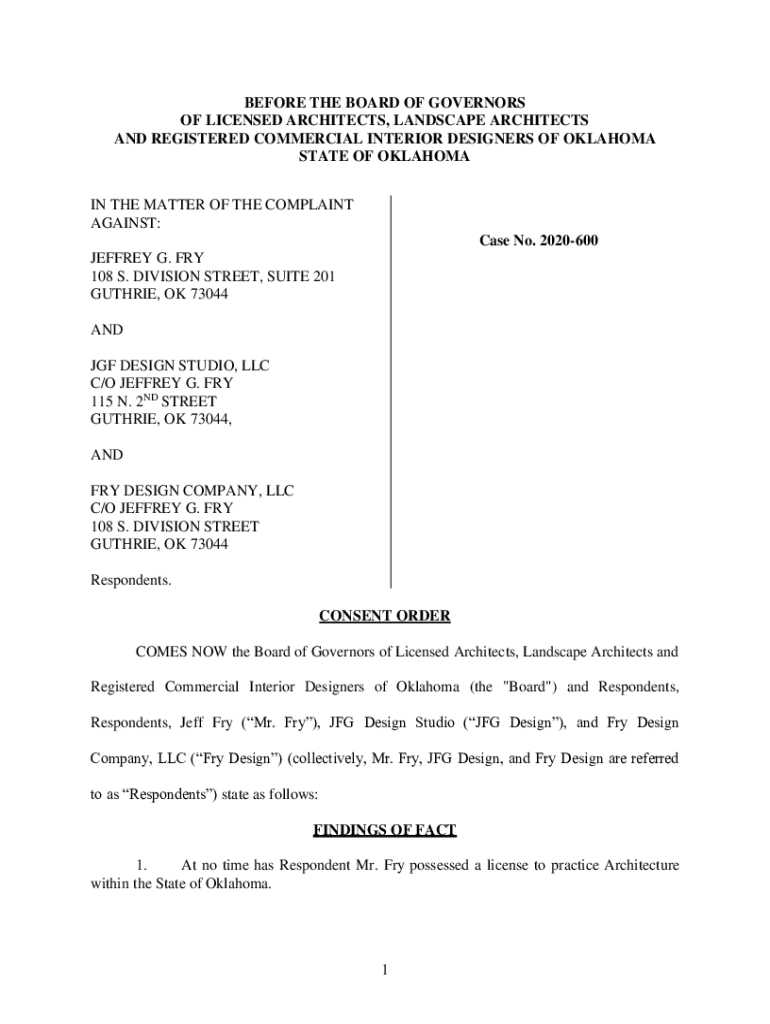 BEFORE THE BOARD OF GOVERNORS OF LICENSED ARCHITECTS, LANDSCAPE ARCHITECTS AND REGISTERED COMMERCIAL INTERIOR DESIGNERS OF OKLAHOMA STATE OF OKLAHOMA IN THE MATTER OF THE COMPLAINT AGAINST: Case No.