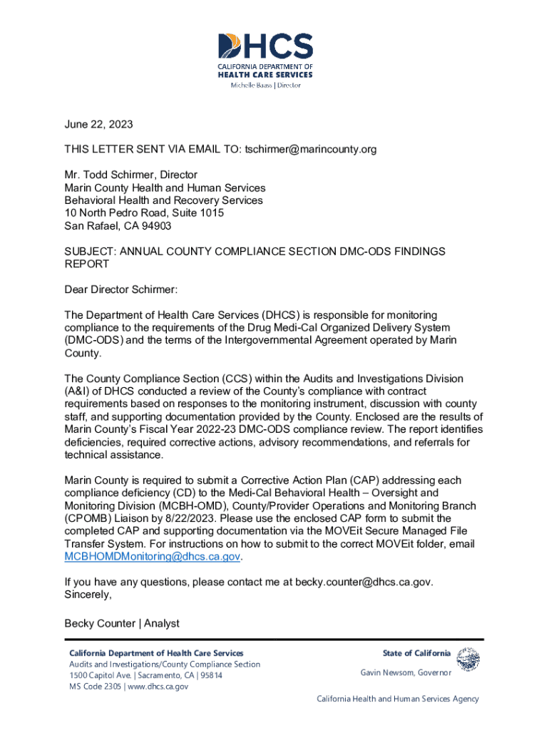 June 22, 2023, THIS LETTER SENT VIA EMAIL TO: tschirmer@marincounty.org Mr. Todd Schiller, Director Marin County Health and Human Services Behavioral Health and Recovery Services 10 North Pedro Road,