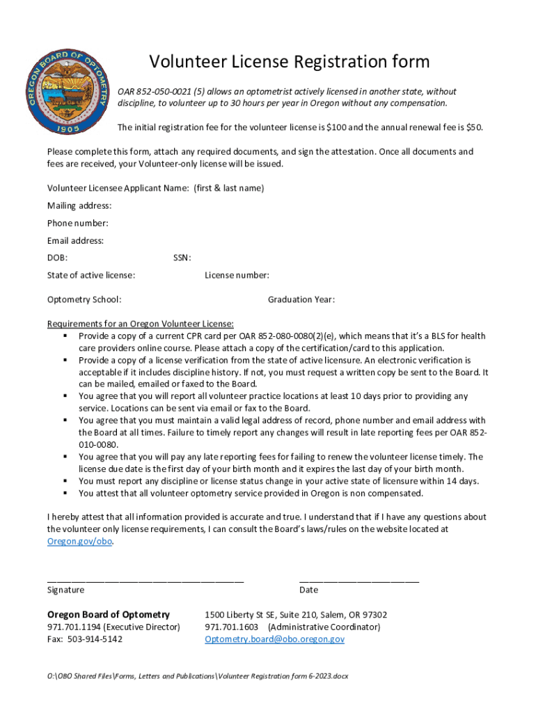 Volunteer License Registration form OAR 8520500021 (5) allows an optometrist actively licensed in another state, without discipline, to volunteer up to 30 hours per year in Oregon without any compensation.