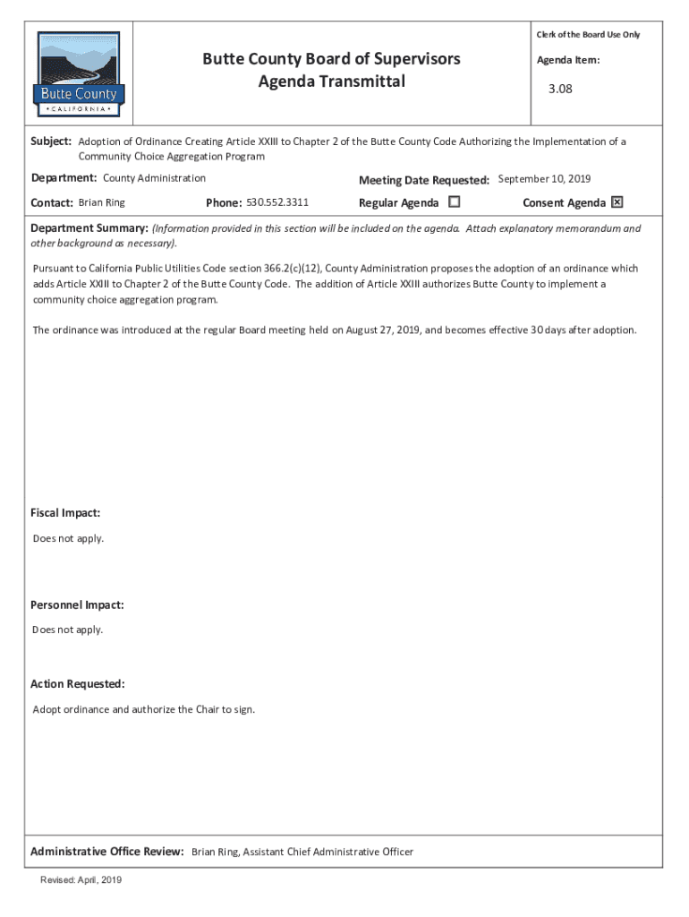 Clerk of the Board Use OnlyButte County Board of Supervisors Agenda TransmittalAgenda Item:3.08Subject: Adoption of Ordinance Creating Article XXIII to Chapter 2 of the Butte County Code Authorizing