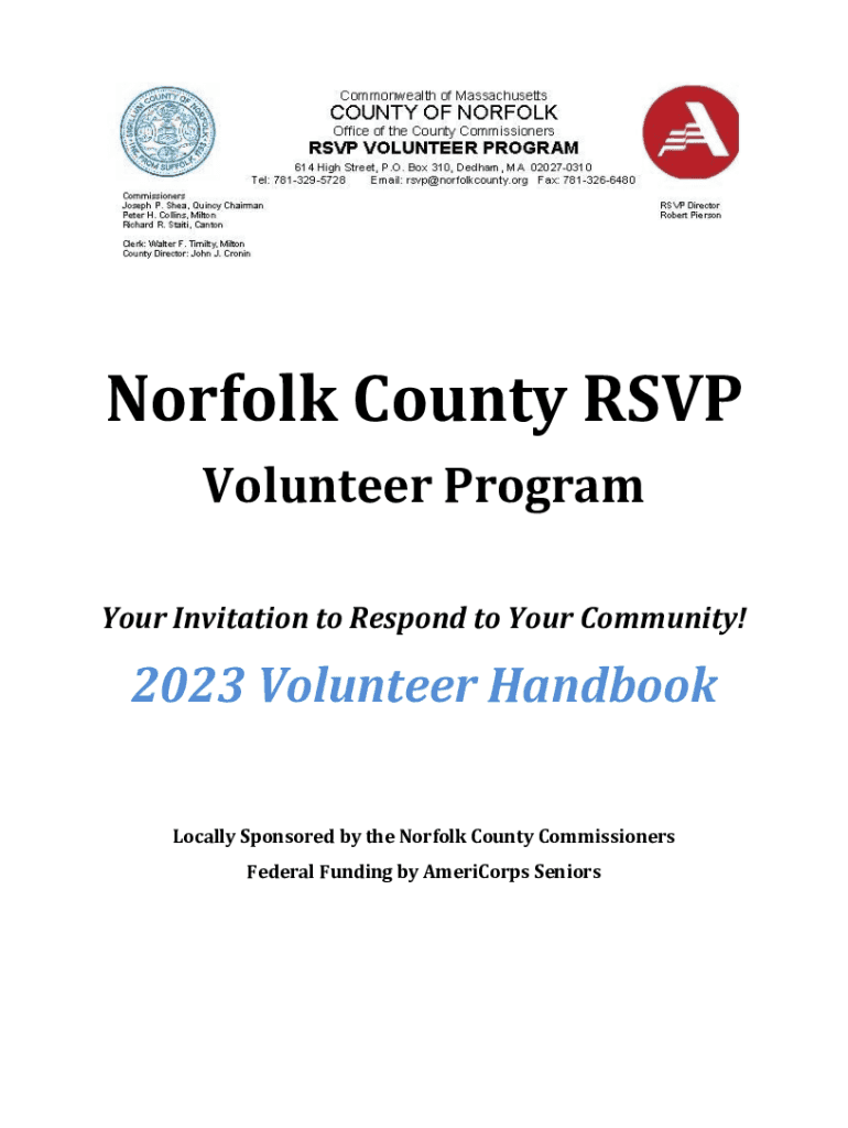 Norfolk County RSVP Volunteer Program Your Invitation to Respond to Your Community!2023 Volunteer Handbook Locally Sponsored by the Norfolk County Commissioners Federal Funding by AmeriCorps SeniorsWelcome
