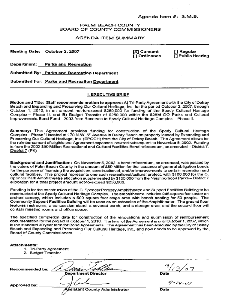 Agenda Item #: 3. M.9. PALM BEACH COUNTY BOARD OF COUNTY COMMISSIONERS AGENDA ITEM SUMMARYMeeting Date:Department:[X] Consent [] Ordinance October 2, 2007[] Regular Public Hearing Parks and RecreationSubmitted