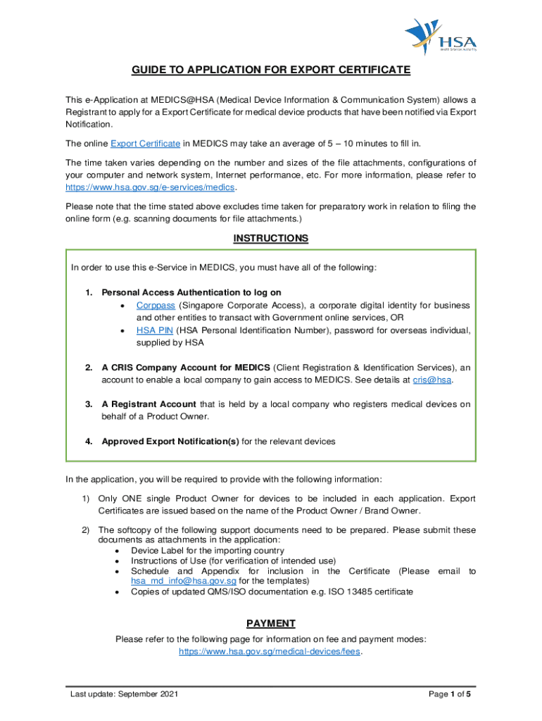 GUIDE TO APPLICATION FOR EXPORT CERTIFICATE This application at MEDICS@HSA (Medical Device Information & Communication System) allows a Registrant to apply for an Export Certificate for medical device