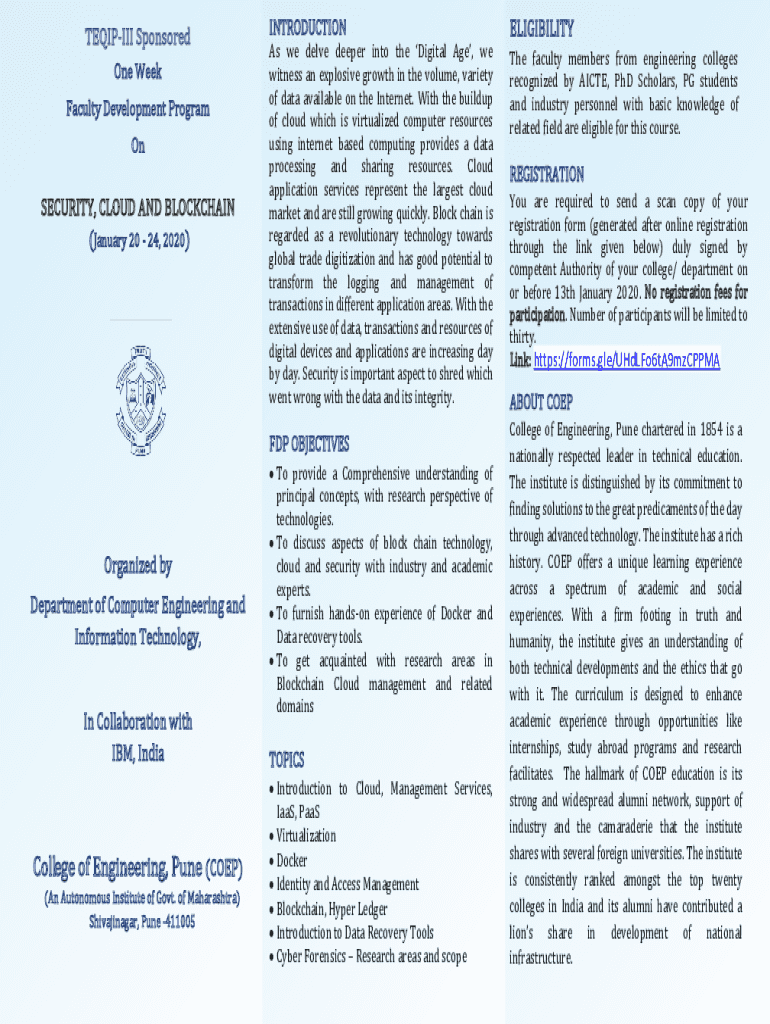 TEQIPIII Sponsored One Week Faculty Development Program Insecurity, CLOUD AND BLOCKCHAIN (January 20 24, 2020)INTRODUCTION As we delve deeper into the Digital Age, we witness an explosive growth in