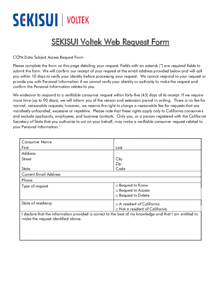 The information required on the Sekisui Voltek web request may vary, but typically includes contact details, nature of request, and any relevant details.