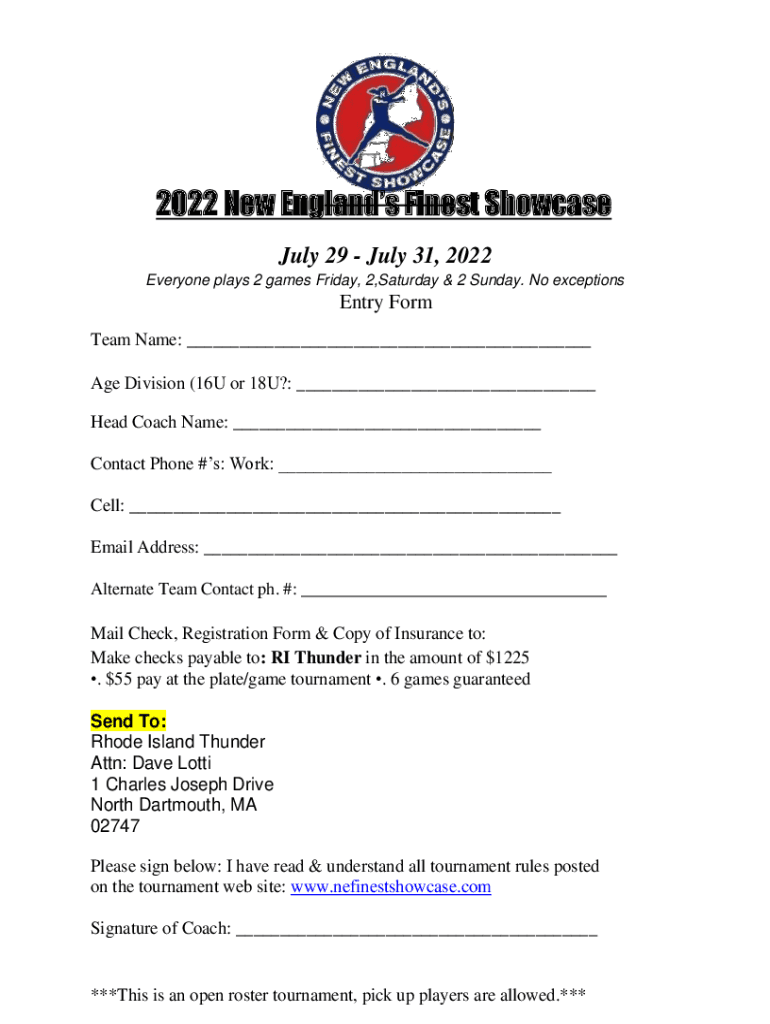 2022 New England's Finest Showcase July 29 July 31, 2022, Everyone plays 2 games Friday, 2,Saturday & 2 Sunday. No exceptionsEntry Form Team Name: ___ Age Division (16U or 18U?: ___ Head Coach Name: