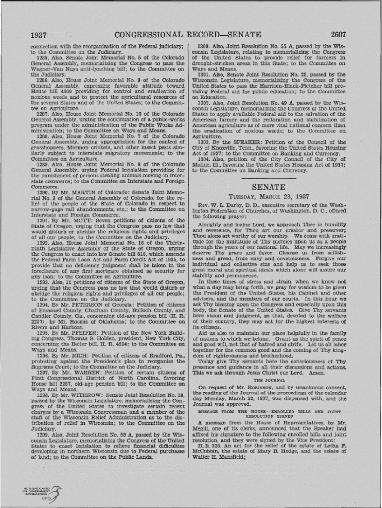 19372607CONGRESSIONAL RECORDSENATEconnection with the reorganization of the Federal judici3. Ry; to the Committee on the Judiciary. 1285. Also, Senate Joint Memorial No. 5 of the Colorado General
