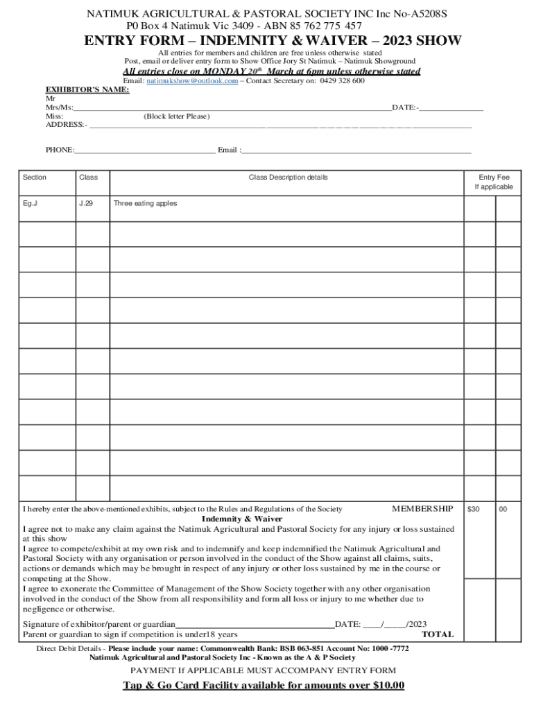 NATICK AGRICULTURAL & PASTORAL SOCIETY INC NoA5208S P0 Box 4 Natick Vic 3409 ABN 85 762 775 457ENTRY FORM INDEMNITY & WAIVER 2023 SHOW All entries for members and children are free unless otherwise