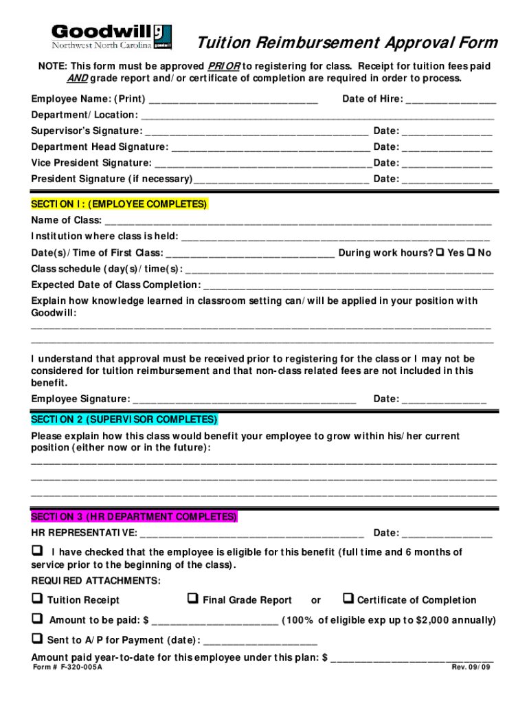 Tuition Reimbursement Approval Form NOTE: This form must be approved PRIOR to registering for class. Receipt for tuition fees paid AND grade report and/or certificate of completion are required in