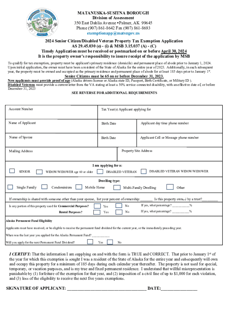 MATANUSKASUSITNA BOROUGH Division of Assessment 350 East Dahlia Avenue Palmer, AK 99645 Phone (907) 8618642 Fax (907) 8618693 exemptionapp@matsugov.us 2024 Senior Citizen/Disabled Veteran Property
