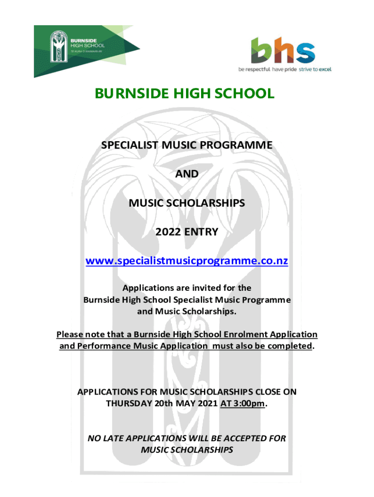 BURNSIDE HIGH SCHOOLSPECIALIST MUSIC Program AND MUSIC SCHOLARSHIPS 2022 ENTRY www.specialistmusicprogramme.co.nz Applications are invited for the Burnside High School Specialist Music Program and