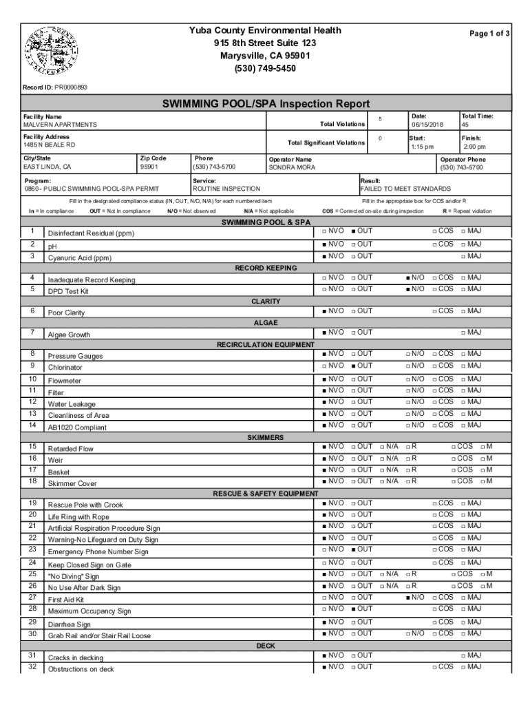 Cuba County Environmental Health 915 8th Street Suite 123 Marysville, CA 95901 (530) 7495450Page 1 of 3Record ID: PR0000893SWIMMING POOL/SPA Inspection Report Facility Name TAVERN APARTMENTSTotal