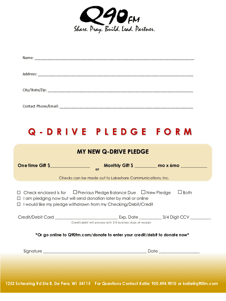Share. Pray. Build. Lead. Partner. Name: ___Address: ___City/State/Zip: ___Contact Phone/Email: ___Q D R I V EP L E D G EF O R MAY NEW DRIVE PLEDGE One time Gift $___monthly Gift $ ___ mo x 6mo ___Checks