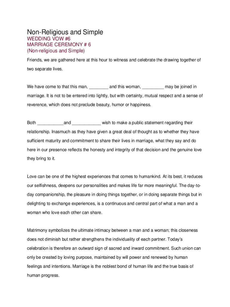 Nonreligious and Simple WEDDING VOW #6 MARRIAGE CEREMONY # 6 (Nonreligious and Simple) Friends, we are gathered here at this hour to witness and celebrate the drawing together of two separate lives.