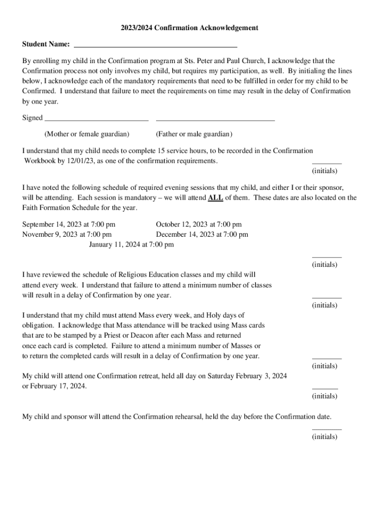 2023/2024 Confirmation Acknowledgement Student Name: ___ By enrolling my child in the Confirmation program at St's. Peter and Paul Church, I acknowledge that the Confirmation process not only involves